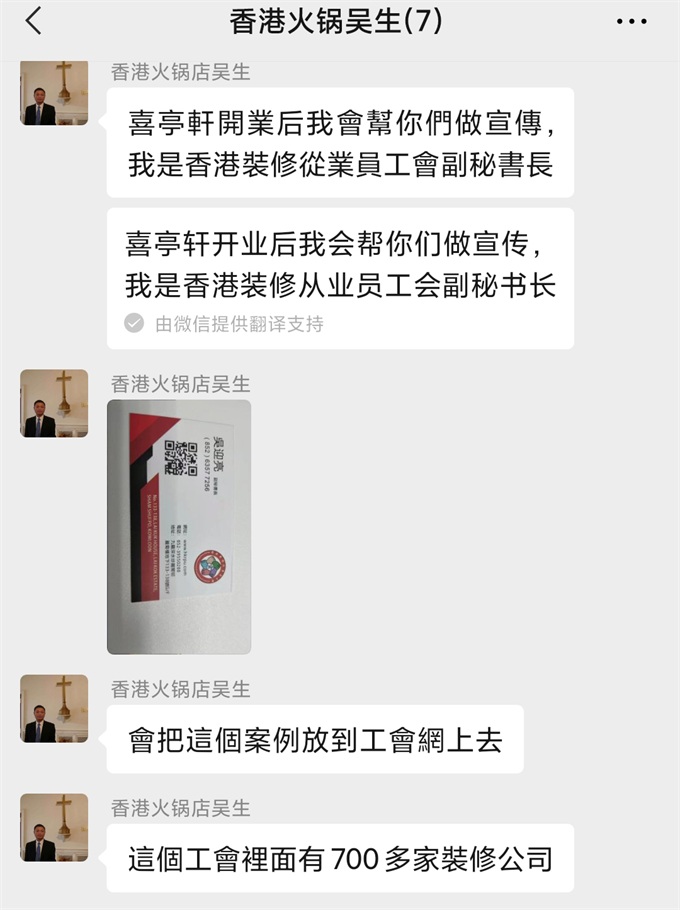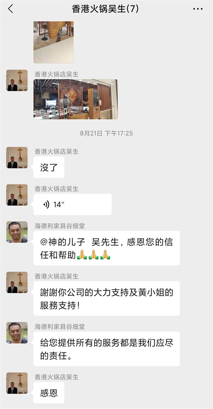 在和喜亭軒火鍋項目負責吳先生合(hé)作的(de)過程,公司和吳先生都會站在(zài)對方的立場上做事情,雙方都很配合。這個訂單生產的很順利。我們的產品到達客戶餐廳後得到客戶的認可。在和(hé)吳先生的(de)溝通中得知他是香港裝修從業員工會副秘書長,會幫助我們宣傳產品。