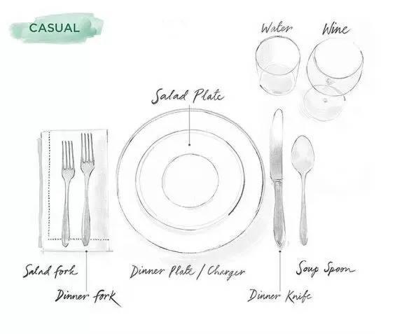 首先談談餐桌的布局。如今美國大多數(shù)的(de)餐館(甚(shèn)至包括一些(xiē)米其林三星的餐館)都更崇尚簡約隨意的風格。非正式的(de)餐桌布局如下麵(miàn)這張圖所(suǒ)示: