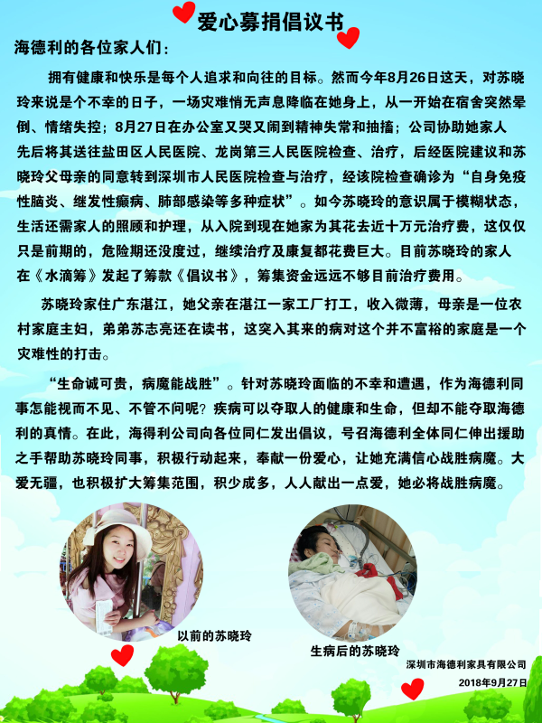 “生命誠可貴,病魔能戰勝”。海德利公司是一家團結友愛、互相幫助的大(dà)家庭,針對蘇(sū)曉玲的不幸和遭遇,作為海德利家人怎能(néng)袖手旁觀呢?疾病可以奪(duó)取人的健康和生命,但卻不能奪取海德利的真情。在此,海得利公司穀先生在公司中層幹部會議、早會上發起為(wéi)患病蘇曉玲(líng)同(tóng)事(shì)獻愛心、送幫助募捐倡議,號召海德利公司(sī)全體員工伸出援助之手幫助蘇曉玲,積極行動起來,奉獻一份愛心,讓她充滿信心戰勝病魔。於10月7日至(zhì)8日公司穀(gǔ)先生、左先生到各車間用海德利的核心價值觀“感恩”來引導工員工的行(háng)為,從公司領導班子到部門經理、車間主管到普通員工等47人都能踴躍捐款慷慨(kǎi)解囊,為蘇曉玲合計捐款15000元,獻出了自己的愛心。10月10日公司委派(pài)佐忠全和(hé)吳然馳到廣東廣州(zhōu)市三九腦科醫院代表海德利(lì)公司和47員工看望蘇曉玲,同時將15000元募捐款也送到蘇曉玲的手中,並(bìng)希望(wàng)蘇曉玲(líng)安(ān)心養病,早日恢複健康。