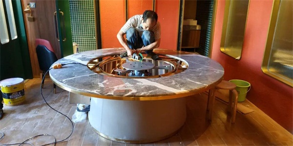 來到祿嬸雞煲(bāo),已經是淩晨了。穀先生人還未進包間,一聲“兄弟們辛苦了”就已經脫口而出(chū)。此時,海德(dé)利的安裝(zhuāng)師傅兄弟(dì)們正在包間裏(lǐ)聚精會神(shén)的安裝陶瓷岩(yán)板電動火鍋桌(電動火鍋桌是在電(diàn)動(dòng)餐桌不影響(xiǎng)轉動的功能下,在桌麵上加上電磁(cí)爐(lú)直接加熱。桌麵所采用的陶瓷岩板,是一(yī)種新型材料,相比傳統(tǒng)材料,具有安全衛生、防火耐高溫、抗汙性、耐刮磨、耐(nài)腐(fǔ)蝕(shí)、易清潔的優點),並沒有(yǒu)注意到穀先生的到來。自動轉軸看起來很是複雜,現(xiàn)場幾位安裝(zhuāng)師(shī)傅(fù)兄弟正聚在一起(qǐ)商(shāng)討怎麽正確安裝。最後,在(zài)工人師傅兄弟的共同努力下,還是順利的完成了安裝。(下圖:工人師傅兄弟在祿嬸雞煲安裝(zhuāng)電動火鍋桌家具)