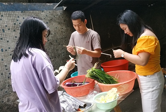 接到任務,我開始(shǐ)馬(mǎ)不停蹄的策劃及部署(shǔ),聯係推廣部準備投影儀及製作創意背景,利用美團跑腿購買蔬菜及燒烤配料,考慮(lǜ)到我們不是專業燒烤師,不擅(shàn)長烤肉類食物(wù),便向穀先生請示(shì)去燒烤店烤肉類,我們自己烤素食,穀先生非(fēi)常讚成!廚房師傅給我們提供了燒烤工具,我們小夥伴就開始一起洗菜、串菜,做的有模有樣!在串菜的同時,薑(jiāng)小(xiǎo)姐也來到了我(wǒ)們公司。