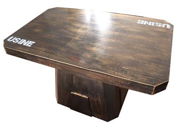 黑色圍邊實(shí)木餐桌_定製桌麵印花(huā)磨砂不鏽鋼底座工業風餐桌